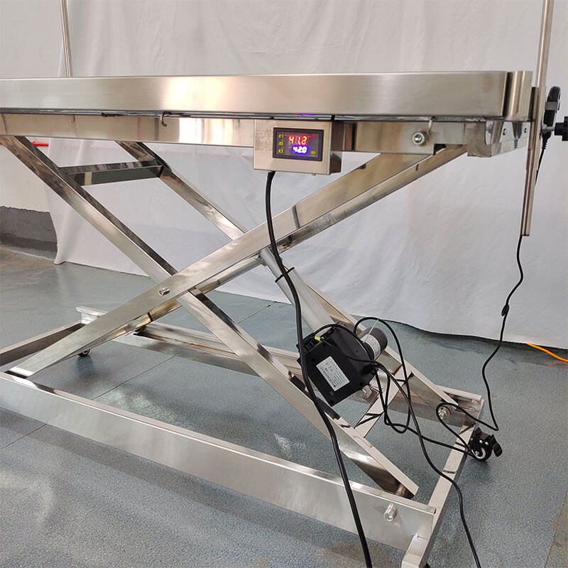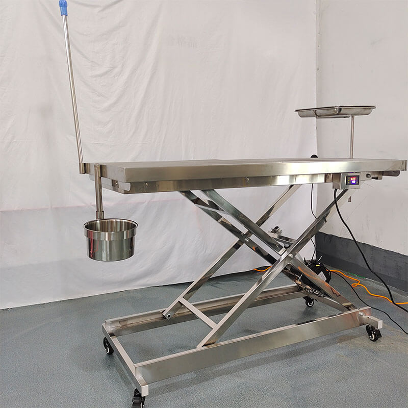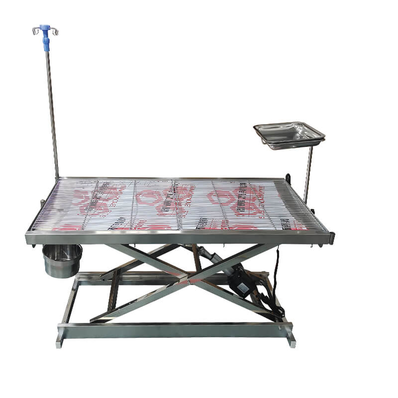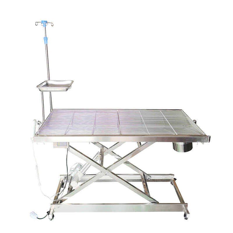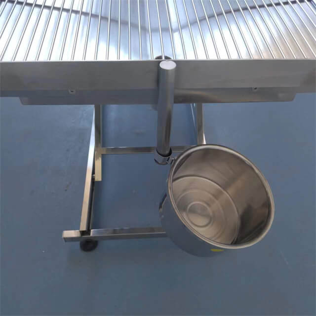 Miza je opremljena z gibljivim okvirjem iz nerjavečega jekla, ki je primeren za odvodnjavanje in čiščenje ter je primeren za hišne živali po operaciji, dezinfekciji in čiščenju. V-oblikovana miza ima vgrajen odtok za odpadno vodo. Zdravila in odpadna voda na operacijski mizi se stekajo v vedro skozi odtok.